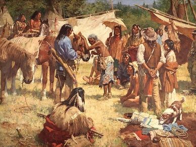 This scene at Rendezvous shows a group of Nez Perce and a white trader observing the initial meeting between a horse doctor and his patient. At some point in the healing process, the horse doctor will open his medicine bag and bring out the magical items and herbs that will, with luck, cure the animal.